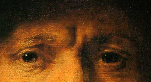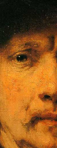 How do we understand a painting that changes like this as we walk closer to it? From a distance, it shows Rembrandt as boldly confident, self-assured, solid -- the powerful grownup genius who outlived the brash youth of the early self-portraits. The painting has been described as having a "somewhat defiant air" that "radiates self-assurance" (Rembrandt by Himself, 190). There is no doubt about that -- from a distance. But as we come close enough to see the face, the painting changes. The confidence begins to melt. The whole face becomes less contained, less definite. The eyes show themselves to be possessed by a tremendous suggestion of pain, or the sympathetic awareness of tremendous pain in others -- or both. Up close, Rembrandt is no longer standing apart, regally looking on. He is instead deeply touched, moved, torn by what he is seeing. All his confident features melt in the direction of an immensely tender sense of empathy. It is an expression that no longer stands apart in isolated superiority. It is the expression of someone who is drawn into the lives and feelings and ventures and sufferings of all he sees. And he sees too well: His unclosing eyes stare on the verge of shock at the severity of what he sees, but a shock enveloped by a responsive, compassionate gentleness. It is as if Rembrandt pays a price for being as good as he is: The price of seeing is to see things as they are. And he must live with what he sees. The beauty and vitality and suffering and self-deception of others become his to know and to feel and to show and to heal. The bold, confident stance of separateness is only an intermediary position. Behind it, inside it, Rembrandt gives himself an expression that joins him with what is before him. He may survive through self-confidence, but he paints through empathy. As part of the painting's gentle irony, the soul he looks deeply into and feels torn with compassion by what he sees, is yours, dear viewer, as you look unsuspectingly up into the penetrating tenderness of his gaze. That helps explain how it is possible to approach this painting and suddenly feel like crying, as you have the richly unnerving experience of being seen by Rembrandt. |