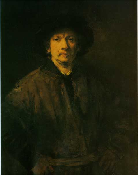 Seen from a distance, the Rembrandt "standing" self portrait in Vienna (1652) shows the bold, confident appearance that is usually attributed to it. |