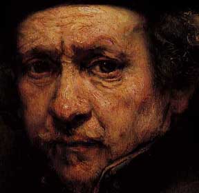 | Rembrandt self-portrait, c. 1628 (Rijksmuseum) | Rembrandt self-portrait, 1659 (National Gallery) |