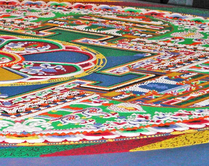 The Mandala was made of millions of tiny grains of colored sand, laid down in flat spreads, raised shapes, and textured patterns.
